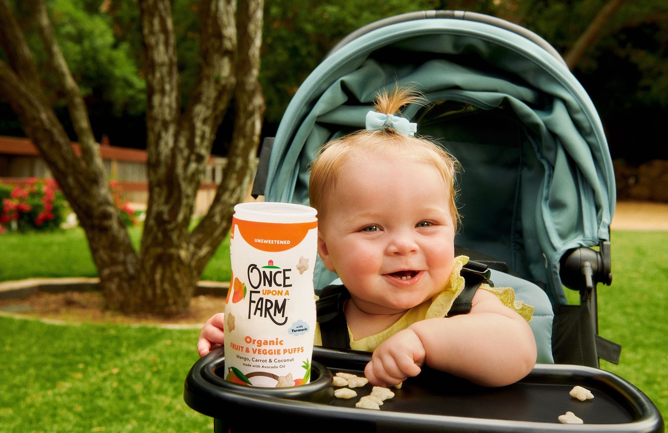 Once you notice your baby can use the thumb and forefinger together, but they still need to practice precision, Potock has another game. “Hold a Once Upon a Farm puff in your own pincer grasp, and hover your hand in front of baby. They will reach out to grasp the puff, and will need to use their thumb and forefinger carefully to do so.” Keep it up, as long as baby (and you) are enjoying the game!