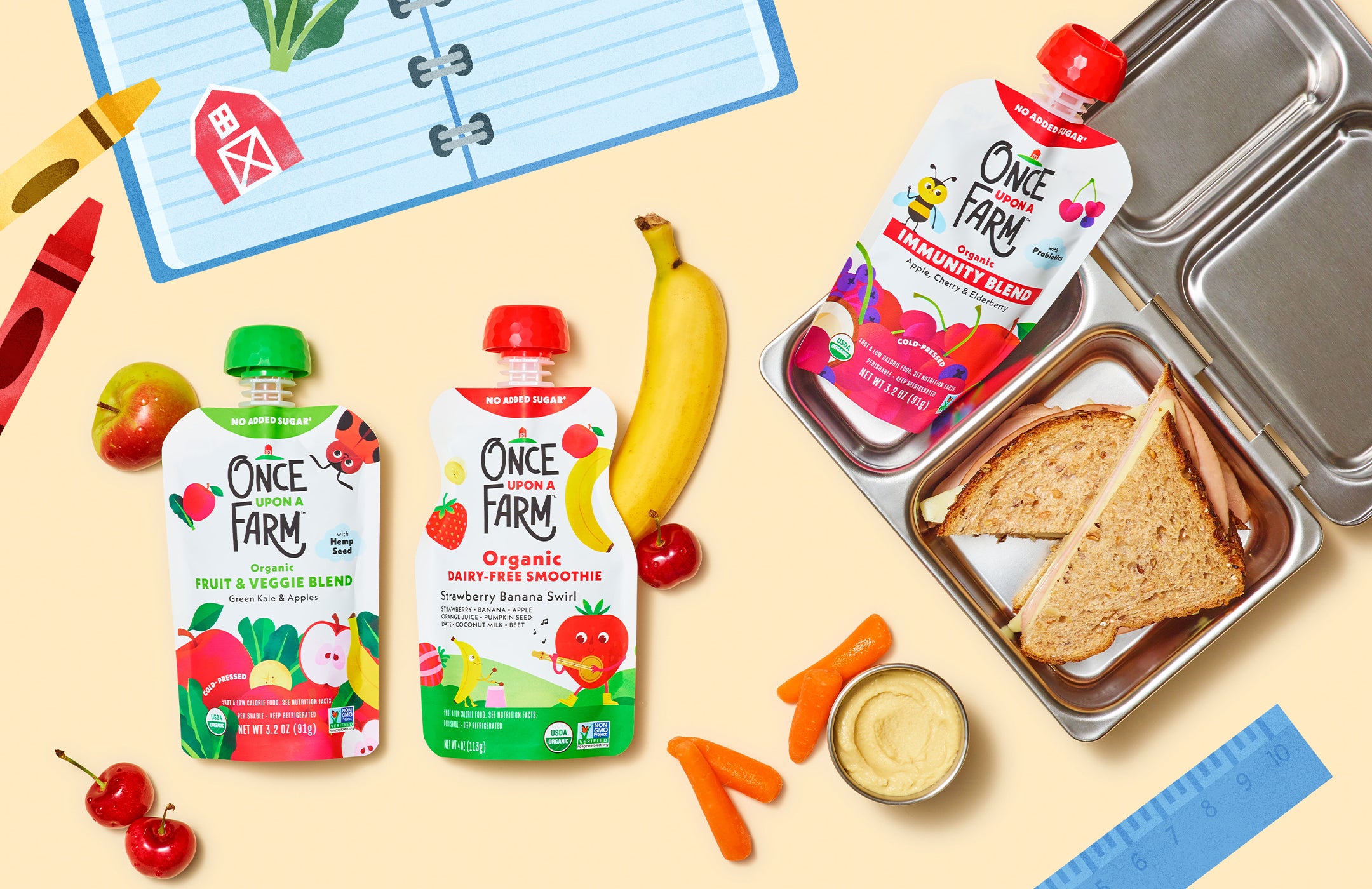 When planning meals for toddlers and older kids, Barnes says, “Incorporate items from all the macronutrient categories (carbohydrates, protein, and fat).” Be sure to include fiber-full foods like fruits and veggies. “Once Upon a Farm Smoothie pouches are one of my favorite ways to help cover my bases in lunches for my kids,” because they are nutritional, and they “help to keep kids full and more energized for longer.”