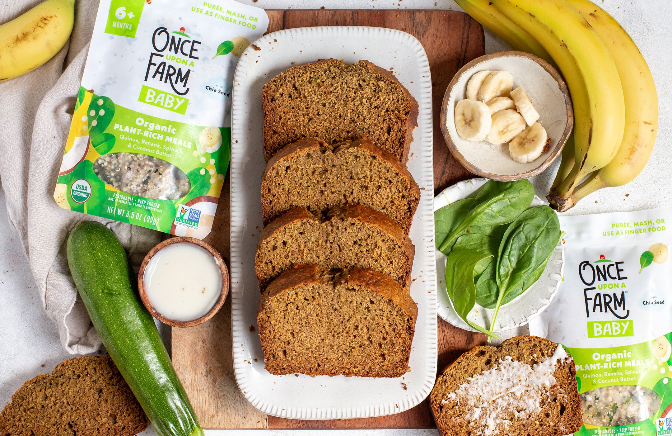 You've tried banana bread. You've maybe even tried zucchini bread. But have you ever tried banana zucchini bread? This recipe—inspired by and made with one of our Plant-Rich Meals—combines an iconic favorite with one of our favorite summer veggies. Created for Once Upon a Farm by Ashley Walterhouse of FitMittenKitchen, this bread is best served warm with melted coconut butter on top!