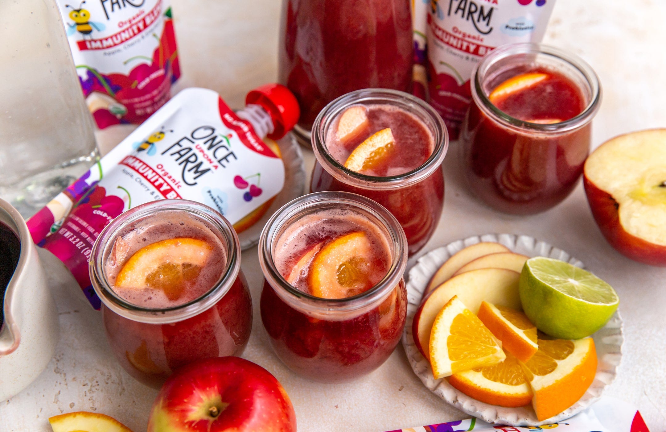 In a large pitcher (32-ounce capacity), add orange juice, cherry juice, lime, Once Upon a Farm pouch, and seltzer water. Stir to combine. Taste test before adding maple syrup. Stir before serving. Add apple and orange slices for garnish. Enjoy!