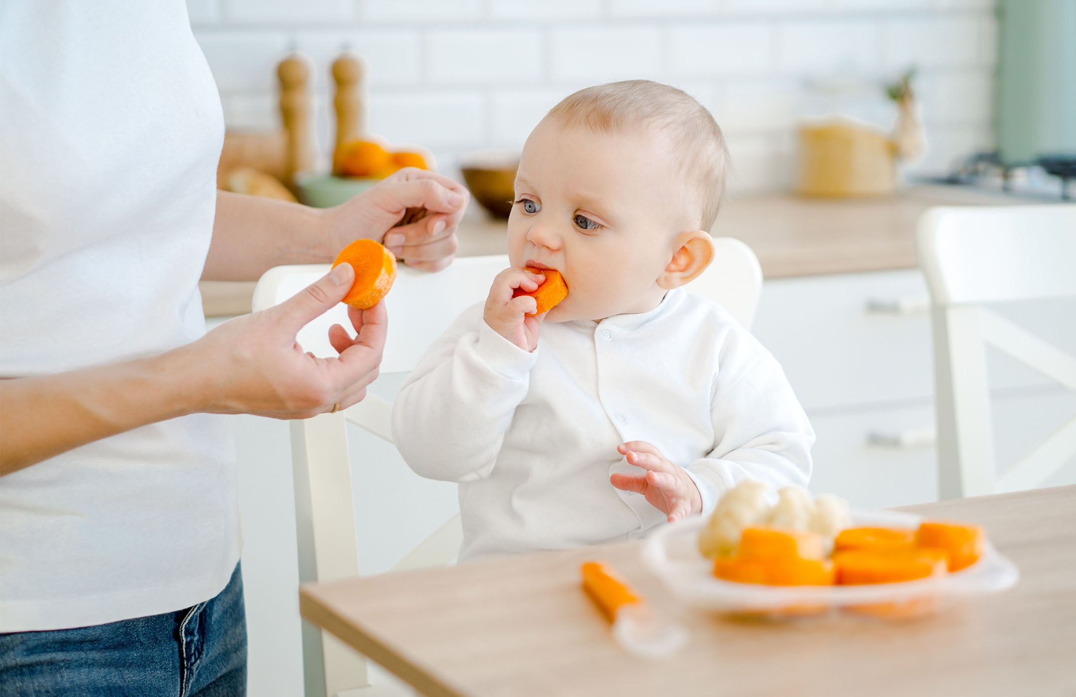 You’ll know your baby is ready to graduate from spoon-feeding to finger foods when they’ve developed a strong pincer grasp (or that pinching grip between the index finger and thumb—think of the motion you use to pick off the booger they’ve smeared onto your sleeve). Other signs that your baby or toddler is ready for finger foods are that they’re able to sit up unassisted and you see them making chewing motions with their gums even when eating purées. These skills are all crucial for safe finger food consumption. As always, consult with your pediatrician if you’re unsure if your child is ready.